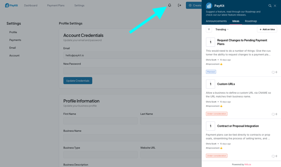 Have a bug to report or really hoping to see a new feature added to PayKit? You can do all of that (plus take a look at our roadmap and any announcements) at https://feedback.paykit.io, or by clicking the bell icon inside PayKit, like this: